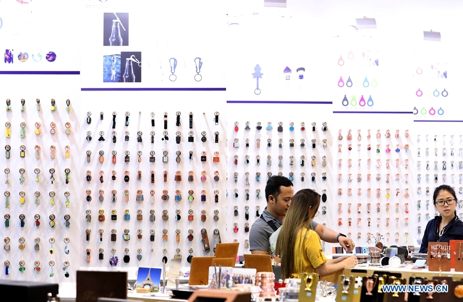 Visitors and exhibitors are seen during the Hong Kong Gifts & Premium Fair 2019 in south China's Hong Kong, April 27, 2019. Over 4,000 exhibitors attend the fair, which kicked off here on Saturday and will last till April 30. (Xinhua/Li Gang)