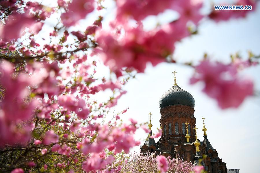 Flowers are seen against the backdrop of St. Sophia Cathedral, a former Russian Orthodox church and a perfect example of Neo-Byzantine architectures, in Harbin, capital of northeast China's Heilongjiang Province, April 29, 2016. (Xinhua/Wang Jianwei)