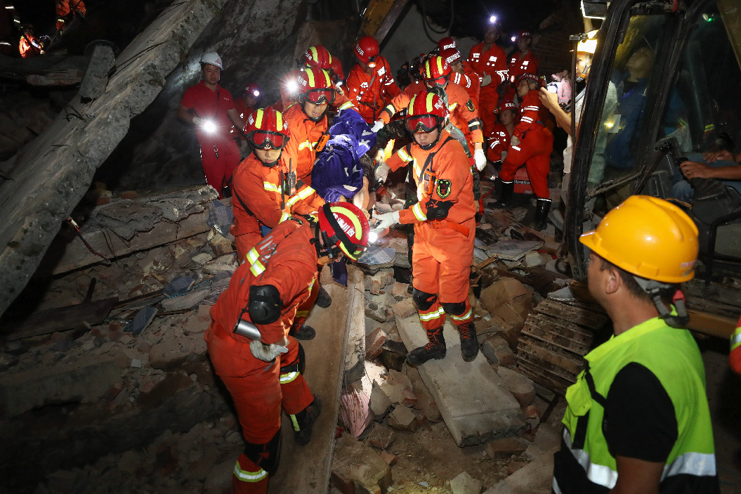 Rescuers work at Putao Village of Shuanghe Town in Changning County of Yibin City, southwest China's Sichuan Province, June 18, 2019. (Xinhua/Zhuang Ge'er)
