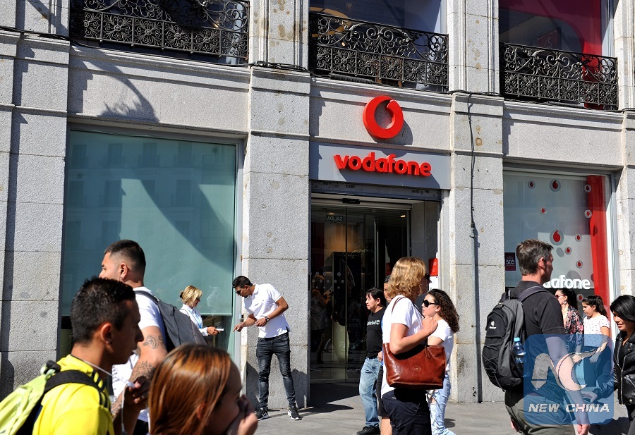 Pedestrians walk past a store of Vodafone Espana in Madrid, Spain, on June 15, 2019. In cooperation with Chinese telecom giant Huawei, Vodafone Espana on Saturday rolled out the first commercial 5G mobile services inSpain, making it one of the first European countries with the ultrafast mobile network in Europe. (Xinhua/Guo Qiuda)