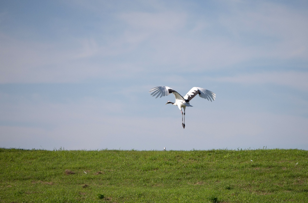 A red-crowned crane is seen flying at Zhalong National Nature Reserve in Qiqihar, northeast China's Heilongjiang Province, July 31, 2018. (Xinhua/Meng Chenguang)