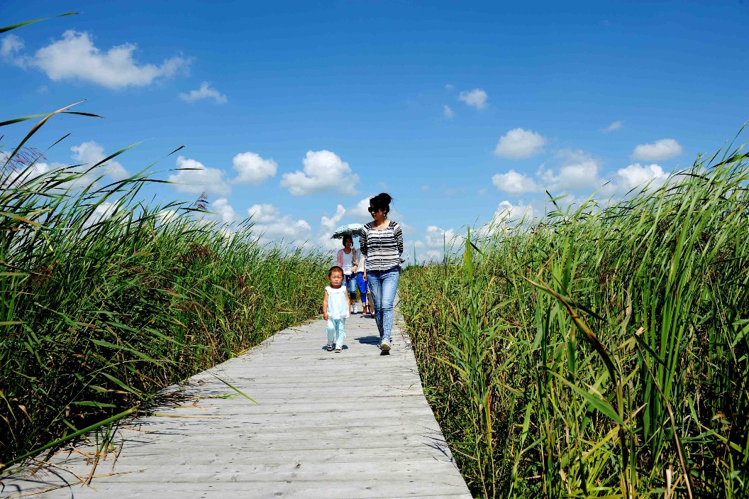 Tourists ramble on a walkway at a wetland in Harbin, capital of northeast China's Heilongjiang Province, Oct. 2, 2016. (Xinhua/Wang Jianwei)