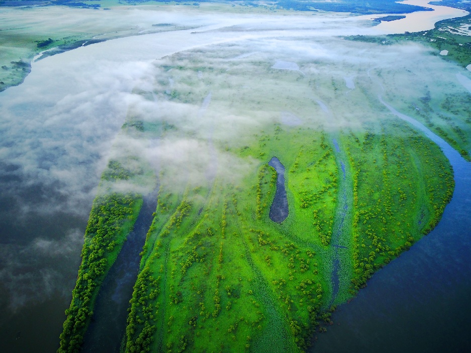 Photo taken on June 16, 2017 shows the wetland scenery amongst the morning mist along the Wusuli River in northeast China's Heilongjiang Province. (Xinhua/Xu Congjun)