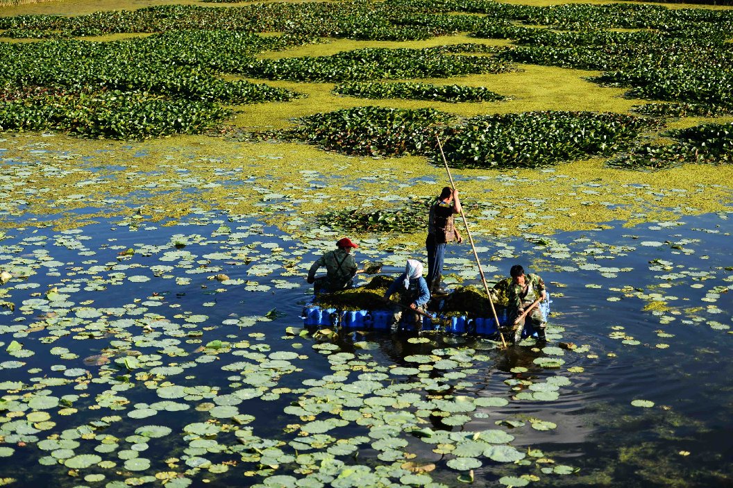 Cleaners work at Longfeng wetland nature reserve in Daqing City, northeast China's Heilongjiang Province, July 3, 2017. (Xinhua/Wang Kai)