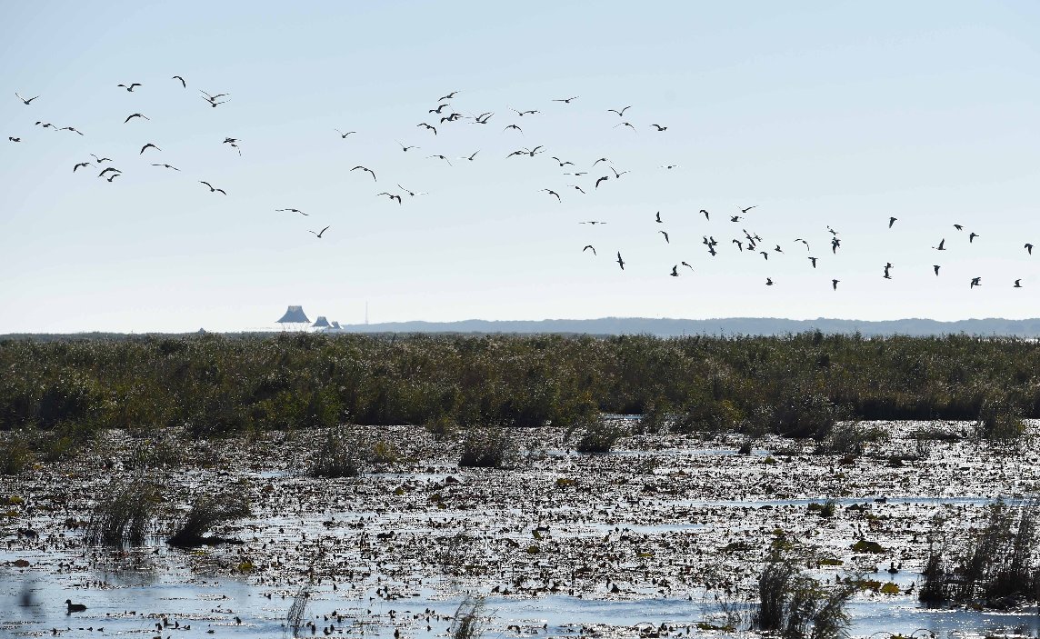 Waterfowls fly above the wetland near Xingkai Lake, border lake between China and Russia, in northeast China's Heilongjiang Province, Sept. 28, 2016. (Xinhua/Wang Jianwei)