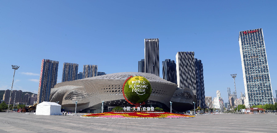 Photo taken on July 2, 2019 shows the Dalian International Conference Center, venue of the Annual Meeting of the New Champions 2019, also known as Summer Davos, in Dalian, northeast China's Liaoning Province. (Xinhua/Yang Qing)