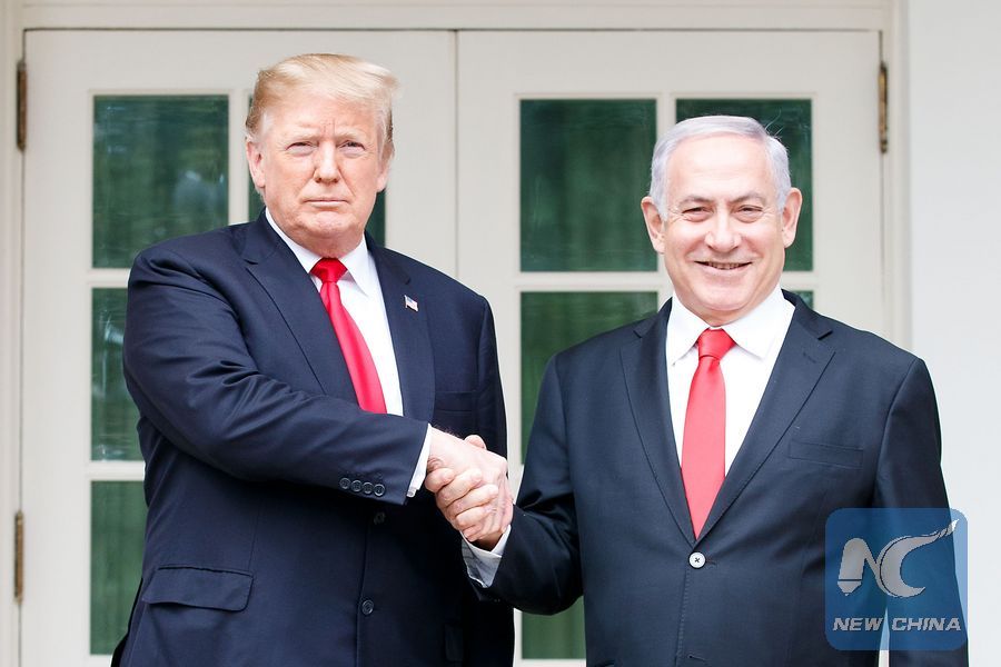 File Photo: U.S. President Donald Trump (L) shakes hands with Israeli Prime Minister Benjamin Netanyahu during their meeting at the White House in Washington D.C., the United States, on March 25, 2019. (Xinhua/Ting Shen)
