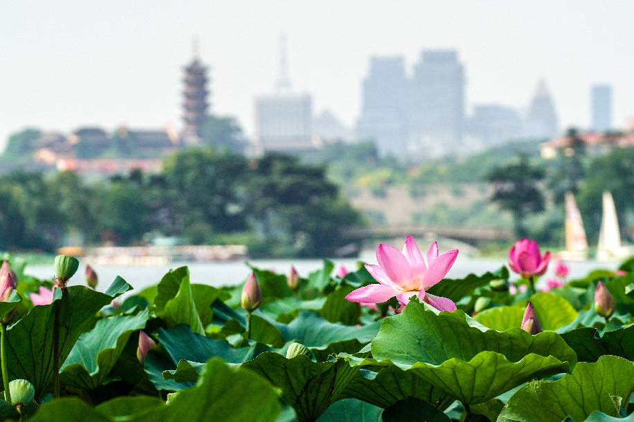 Lotus flowers in Nanjing, east China's Jiangsu Province on July 23, 2019. (Xinhua/Li Bo)