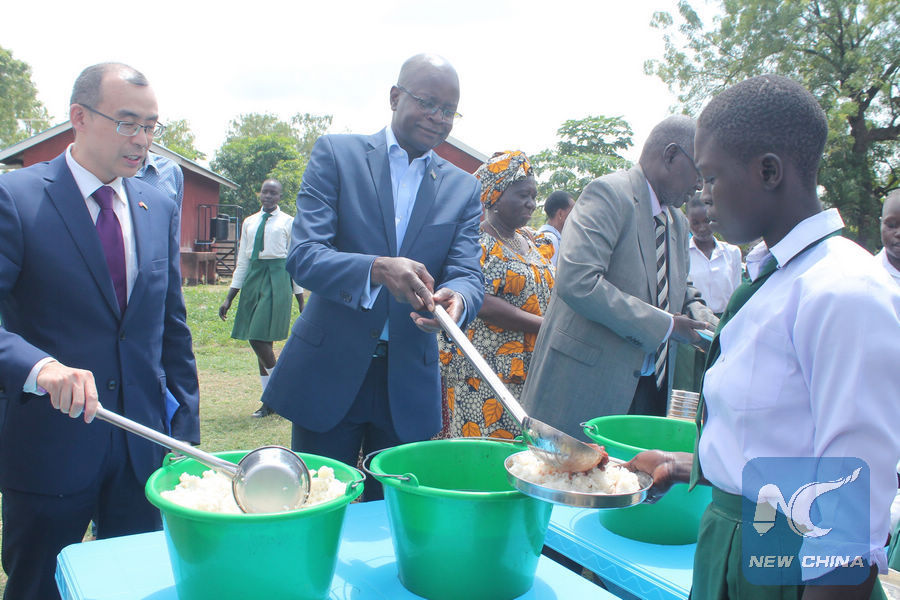 Liu Xiaodong (L), charge d'affairs at the Chinese Embassy in South Sudan and Deng Deng Hoc (2nd L), South Sudan's General Education Minister serve rice to pupils at Juba One Girls Primary School in Juba, capital of South Sudan, July 16, 2019. The Chinese government recent handed over 2,185 metric tons of rice to the United Nations World Food Programme (WFP) to support a school meals project in South Sudan. (Xinhua/Gale Julius)