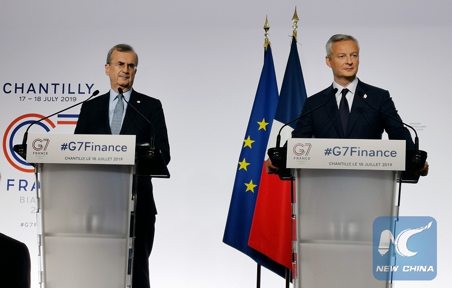 French Finance Minister Bruno Le Maire (R) and Governor of the Bank of France Francois Villeroy de Galhau attend a press conference at the end of the G7 Finance meeting in Chantilly, France, July 18, 2019. (Xinhua/Jiang Hua)