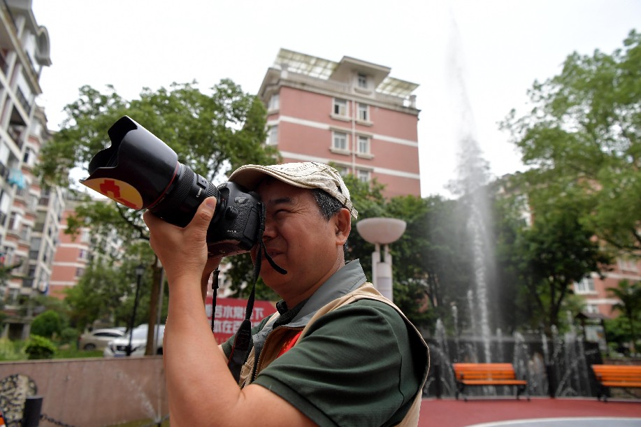Photography enthusiast Yu Heping takes pictures in a residential community which used to fall victim to urban flooding during rainy seasons in Anyuan District of Pingxiang, east China's Jiangxi Province, May 29, 2019. (Xinhua/Peng Zhaozhi)