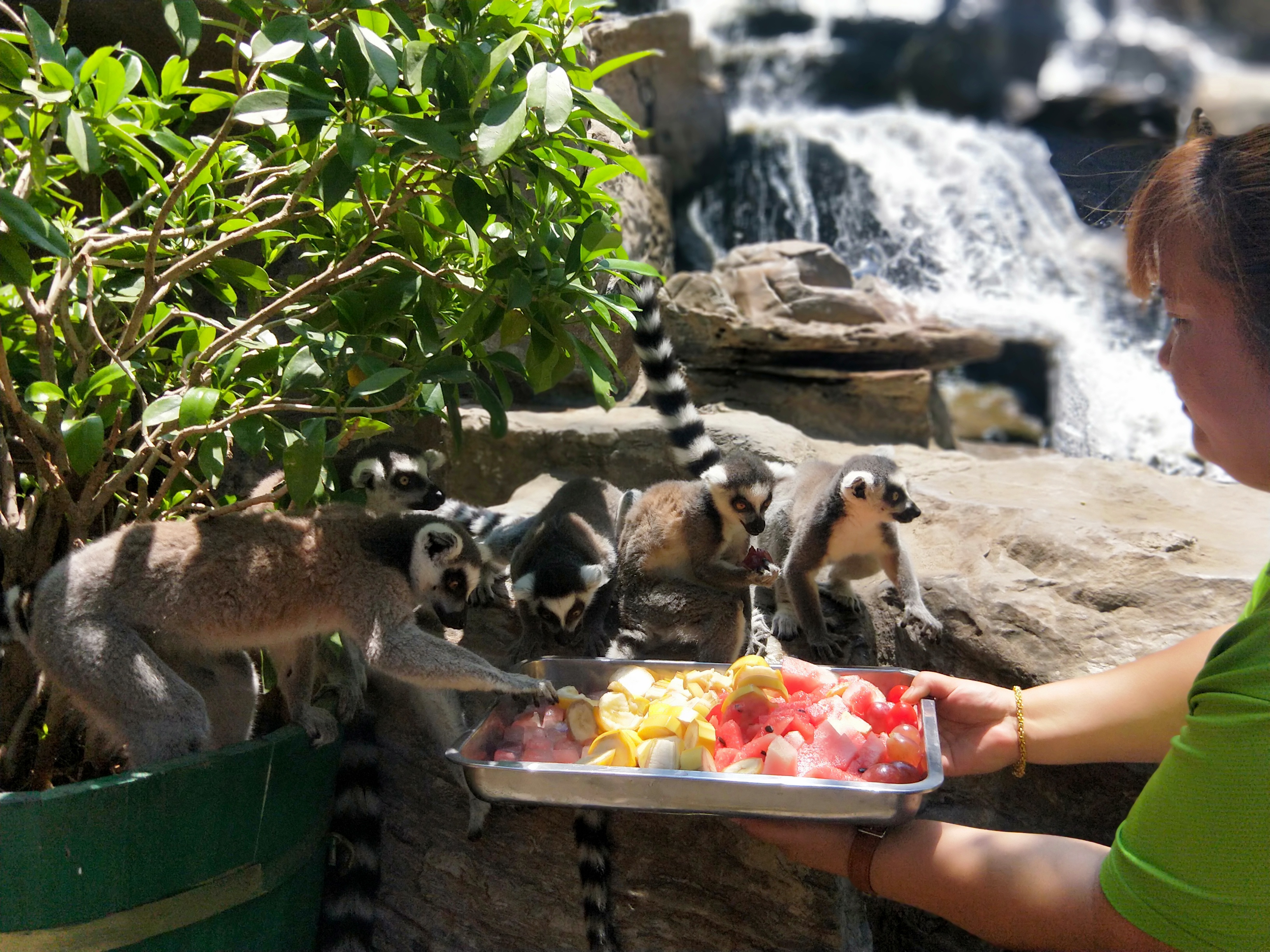Mobile photo shows a staff member feeding lemurs at Beijing Wildlife Park in Beijing, capital of China, July 12, 2019. (Xinhua/Pang Yuanyuan)