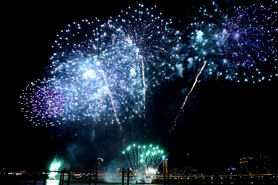 Fireworks explode over the Tamsui river during the 2019 Taipei Dadaocheng Fireworks Festival in Taipei, southeast China's Taiwan, on Aug. 3, 2019 . (Xinhua/Zhu Xiang)