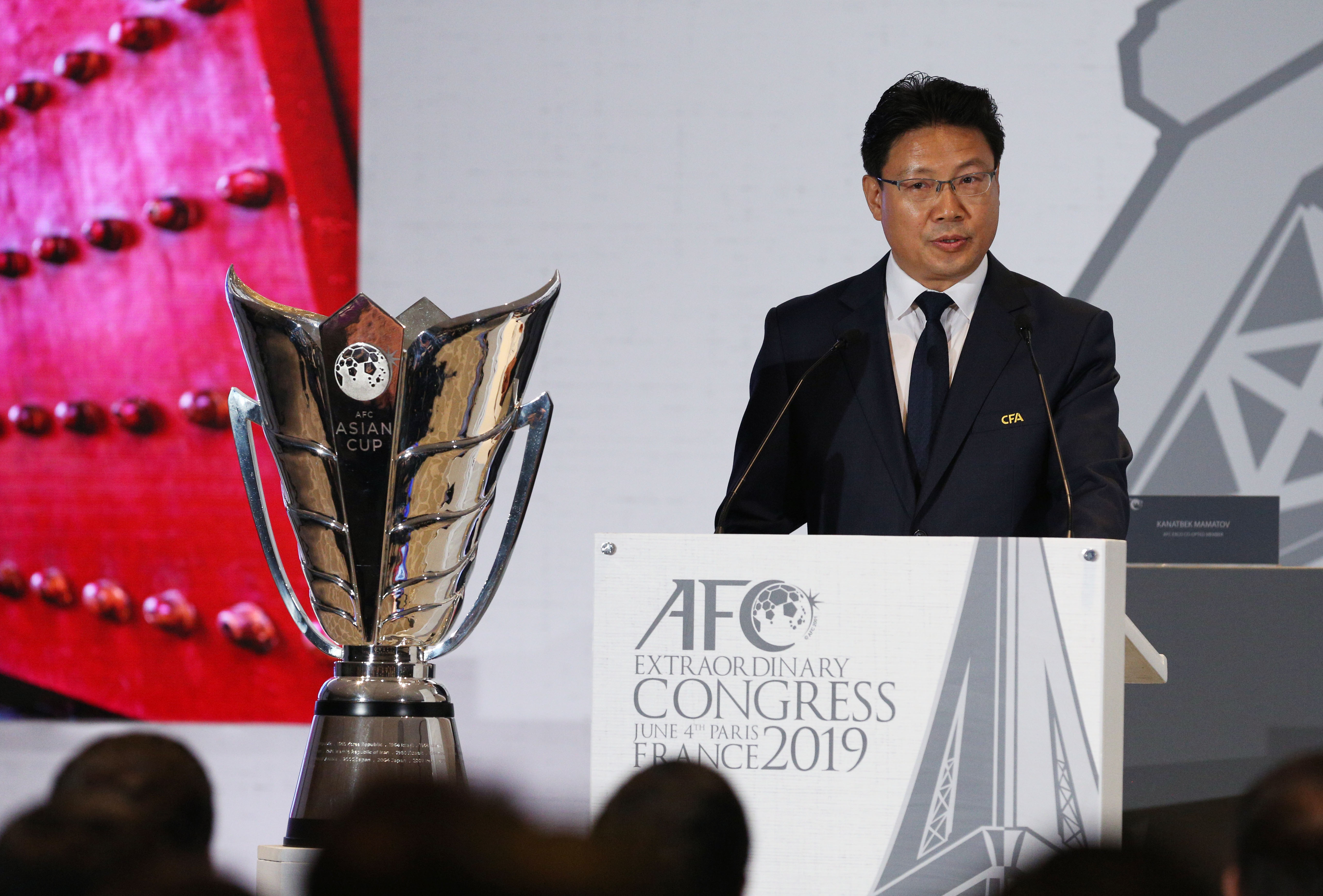 Representative of the Chinese Football Association Lin Xiaohua gives a presentation during the AFC Extraordinary Congress in Paris, France, June 4, 2019. China was confirmed as the host of the AFC Asian Cup 2023. (Xinhua/Gao Jing)