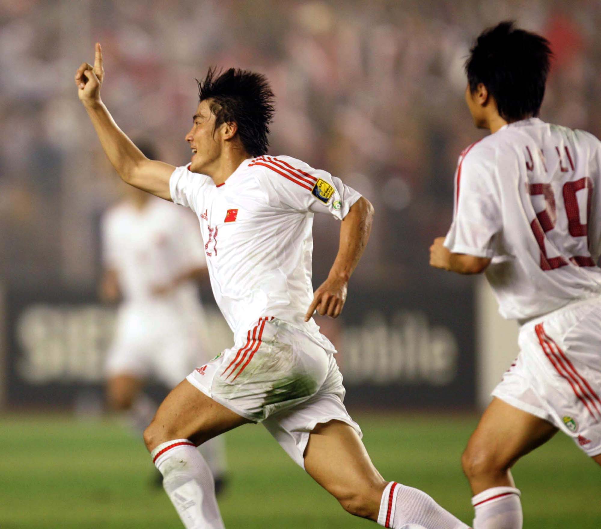 Li Ming of China (L) celebrates his goal during the 2004 Asian Cup final against Japan at the Beijing Workers' Stadium in Beijing, China, on August 7, 2004. China lost to Japan 3-1. (Xinhua/Chen Jianli)