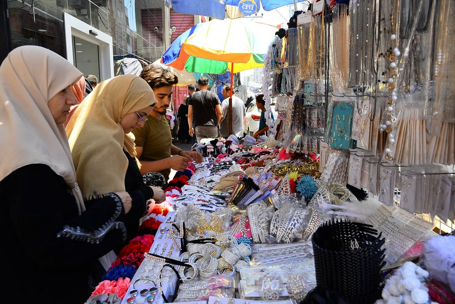 Palestinians shop at a market ahead of the Eid al-Adha, in Gaza City, on Aug. 7, 2019. (Xinhua/Stringer)