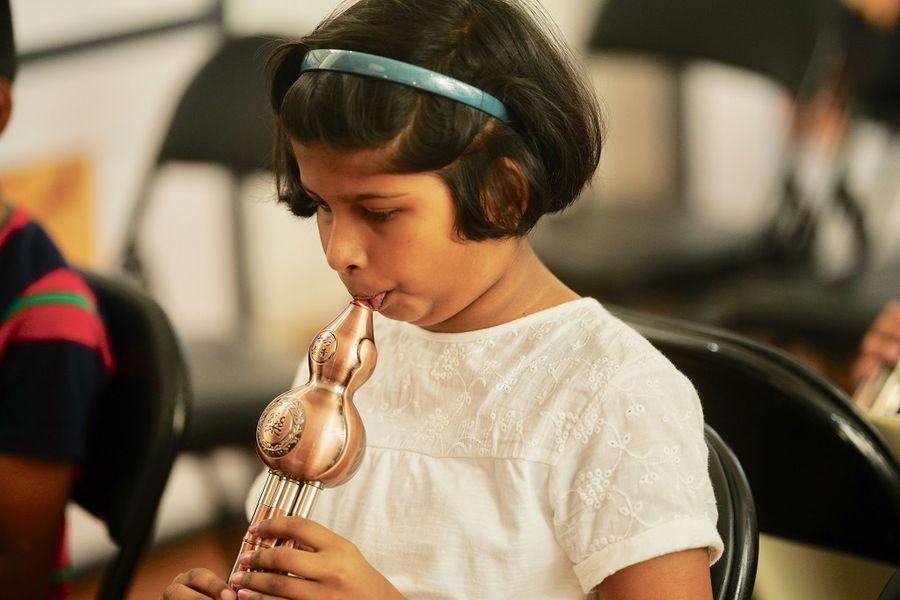 A student in Colombo, Sri Lanka is learning playing Hulusi, a free-reed wind instrument from China, Aug. 9, 2019. (Xinhua/Tang Lu)