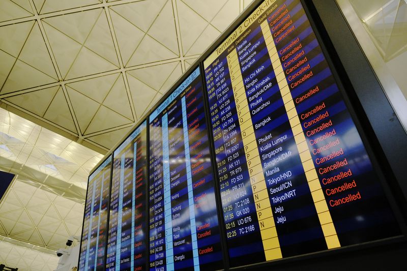 Cancelled flights are shown on a screen at Hong Kong International Airport in Hong Kong, south China, Aug. 12, 2019. (Xinhua/Wang Shen)