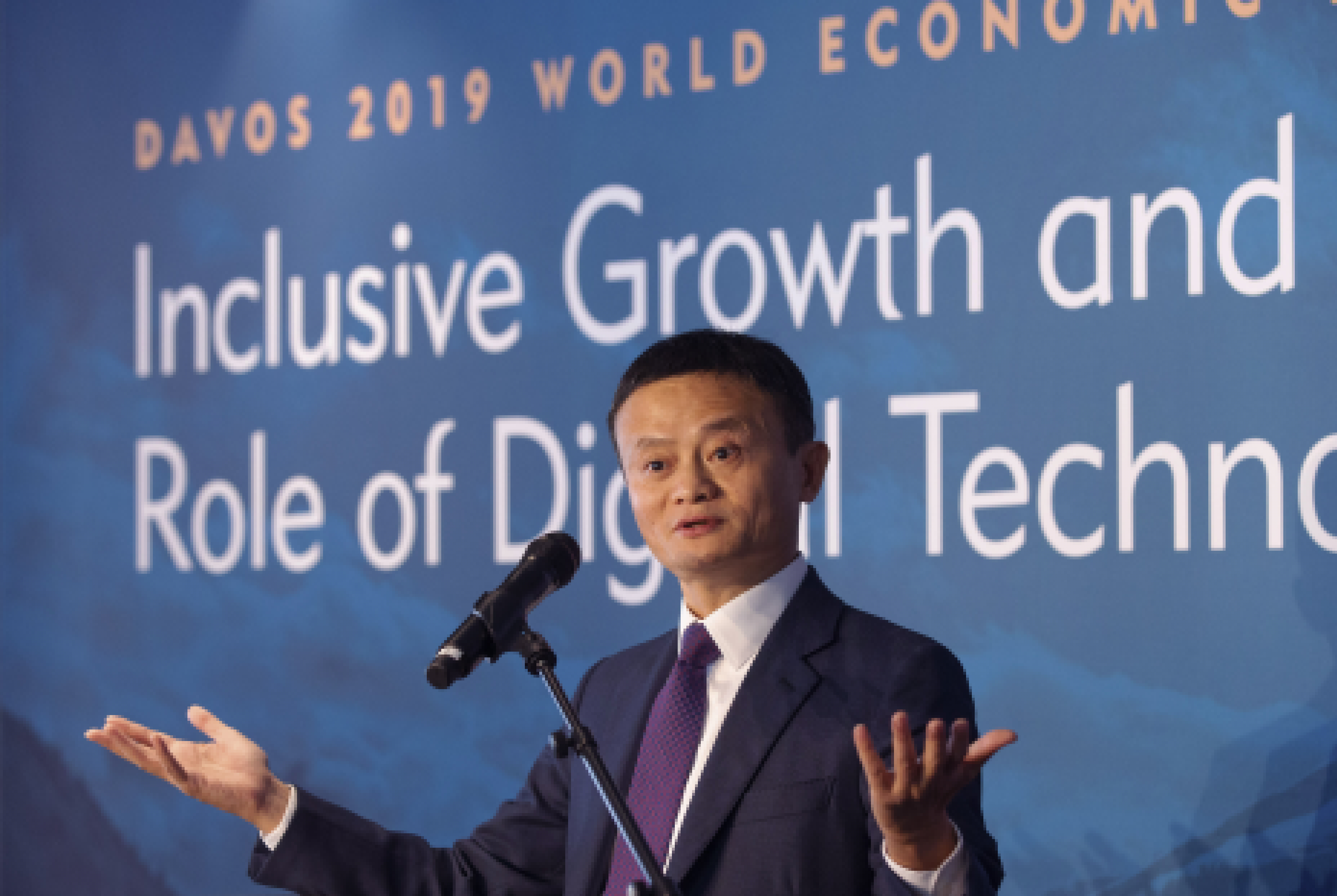Alibaba co-founder and chairman Jack Ma speaks at the 26th World Economic Forum (WEF) annual conference as the Luohan Academy, an Alibaba thinktank, releases a report titled "Digital Technology and Inclusive Growth" in Davos, Switzerland, Jan. 25, 2019. (Xinhua/Xu Jinquan)