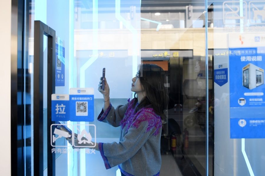 A customer purchases goods at a self-service store, which are required to pay with Alipay, in Hangzhou, capital of east China's Zhejiang Province, Dec. 22, 2017. Worldwide users of Alipay, China's leading online payment platform, exceed 1 billion, according to data released by Alipay on Jan. 9, 2019. (Xinhua/Huang Zongzhi)