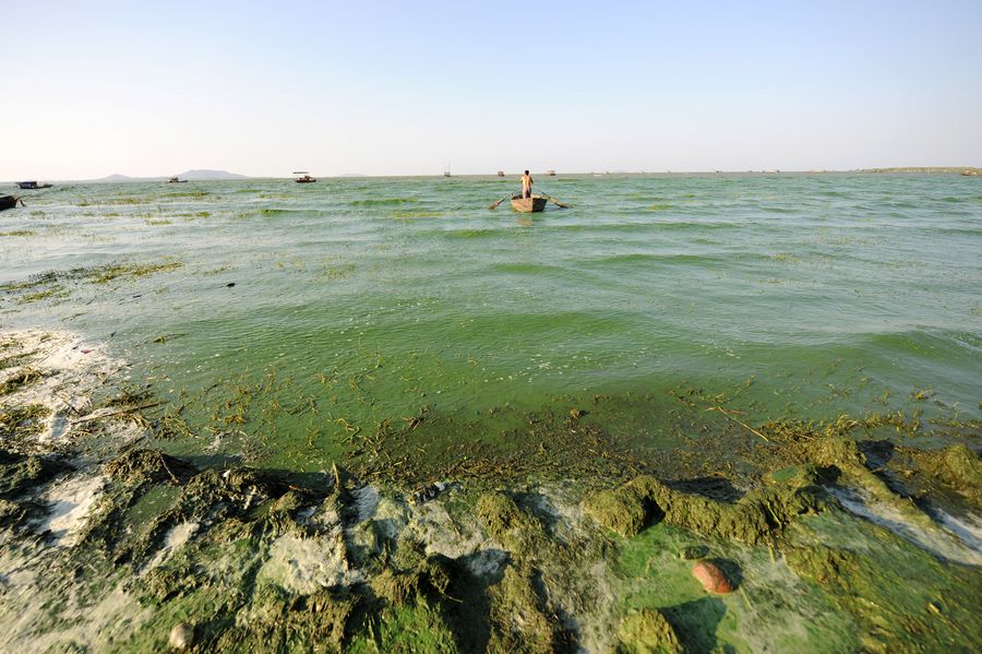 File photo shows a blue algae outbreak in Chaohu Lake, east China's Anhui province. (Xinhua)