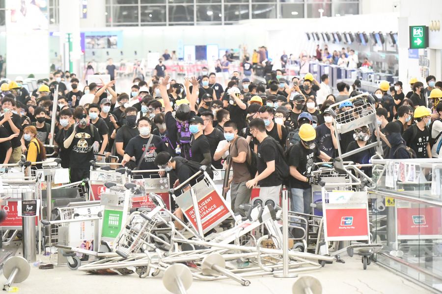 Violent radicals block a passage at Hong Kong International Airport in south China's Hong Kong, Aug. 13, 2019. (Xinhua)