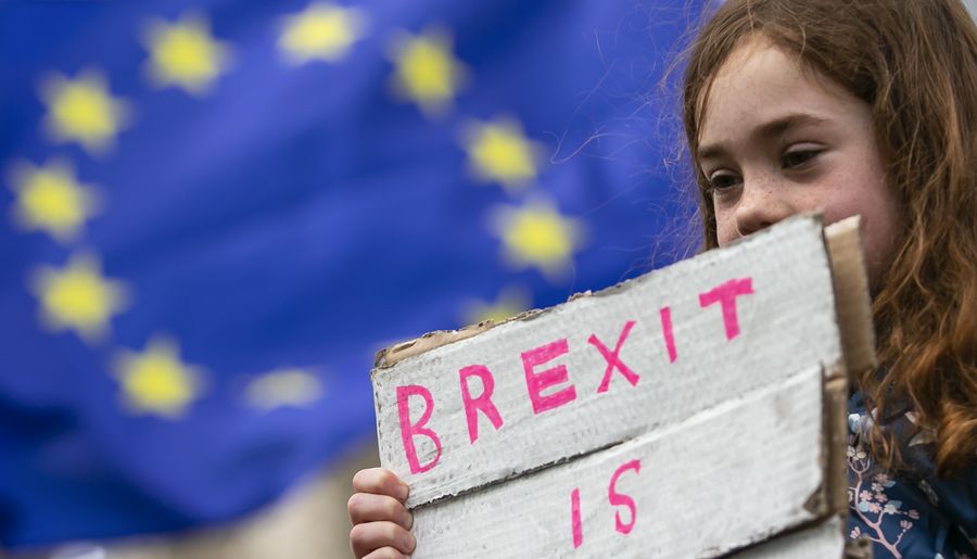 A girl holds a placard during the "Put it to the People" march in central London, Britain, on March 23, 2019. (Xinhua/Han Yan)