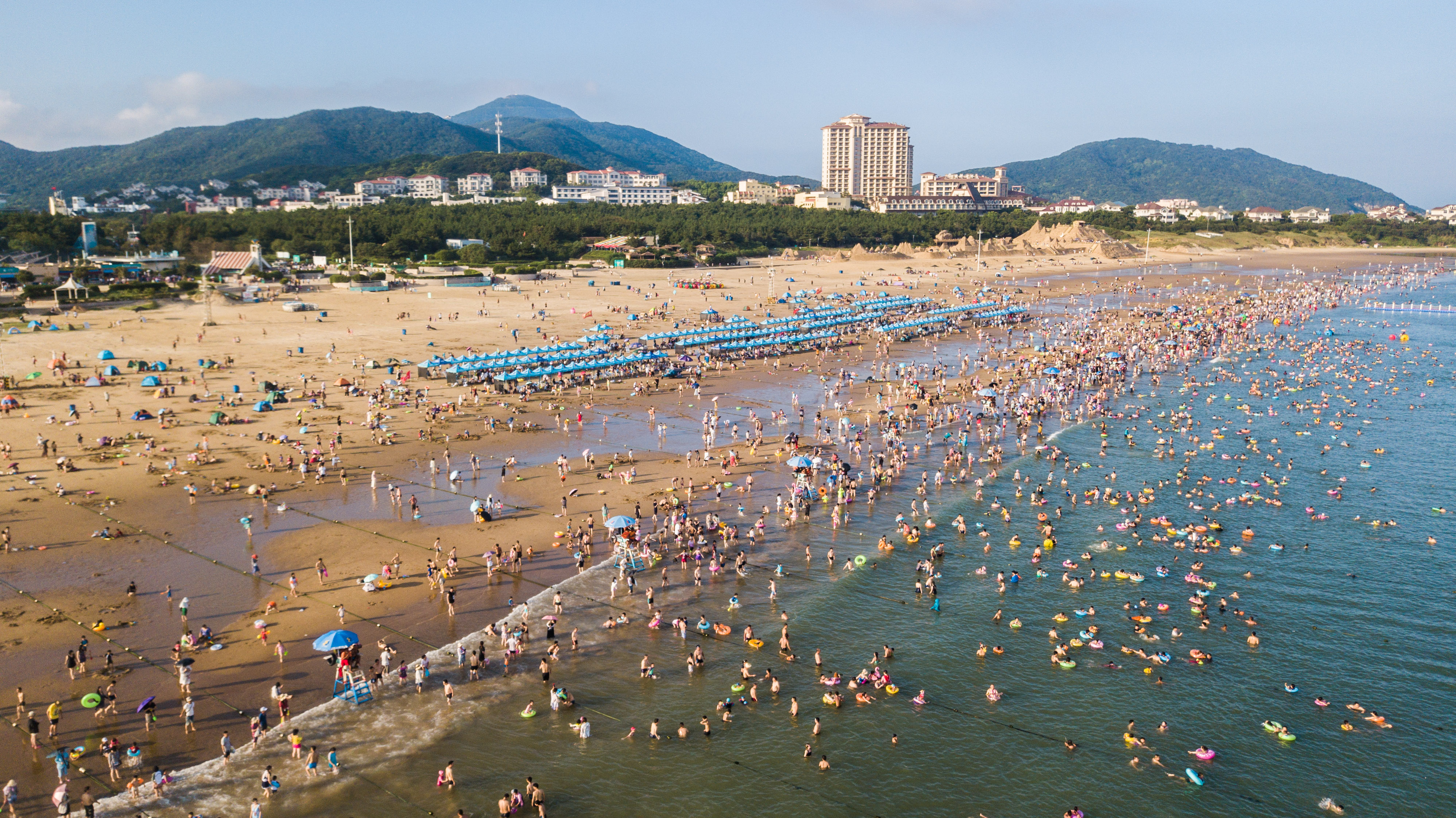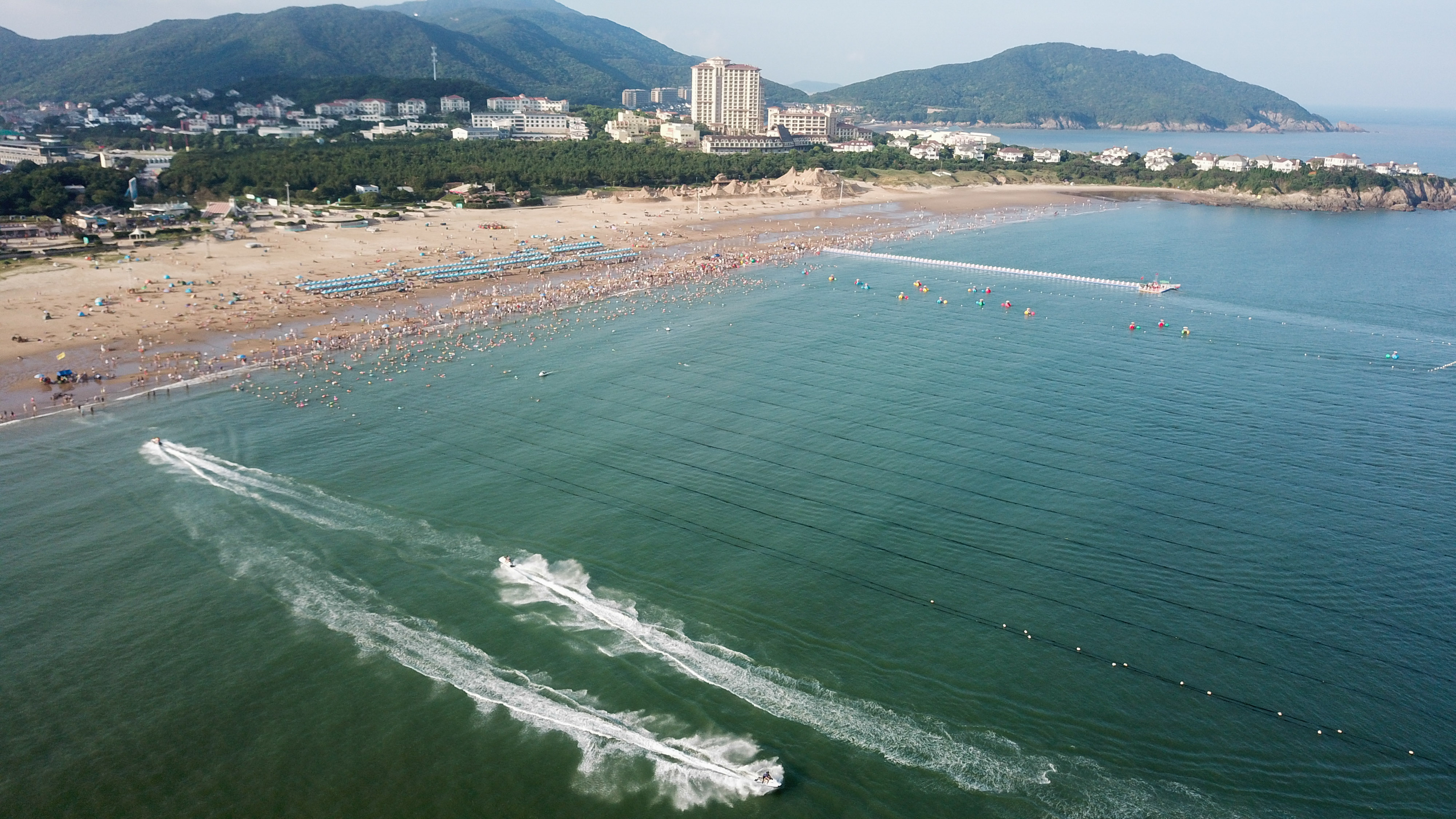 Golden sand beach and rippling green waves brings an increasing number of tourists to Zhujiajian scenic spot in east China's Zhejiang.
