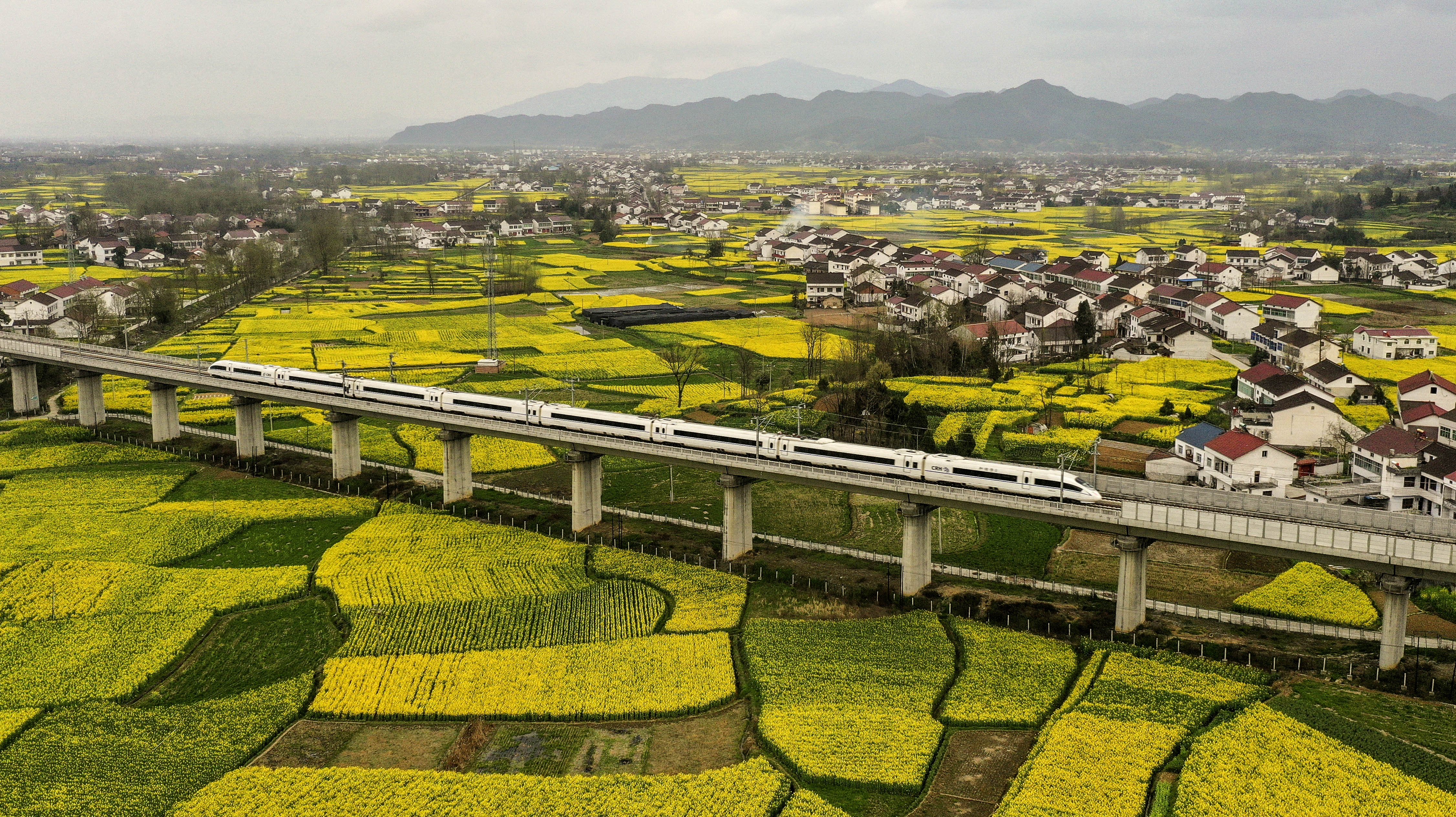 A bullet train runs through cole flowers fields in Xinji Town, Hanzhong City, March 21, 2019. (Xinhua/Tao Ming)