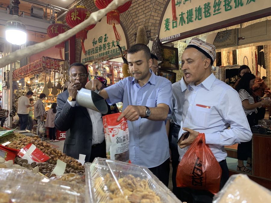 Diplomats buy dried fruits at the Xinjiang International Grand Bazaar in Urumqi, capital city of northwest China's Xinjiang Uygur Autonomous Region, Aug. 19, 2019. (Xinhua/Sun Shaoxiong)