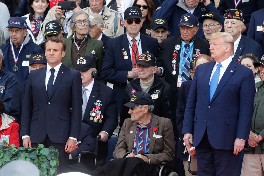 President Emmanuel Macron (L) and U.S. President Donald Trump (R) attend a ceremony to mark the 75th anniversary of the D-Day landings at the Normandy American Cemetery and Memorial in Colleville-sur-Mer, Normandy, France, June 6, 2019. (Xinhua/Mao When)