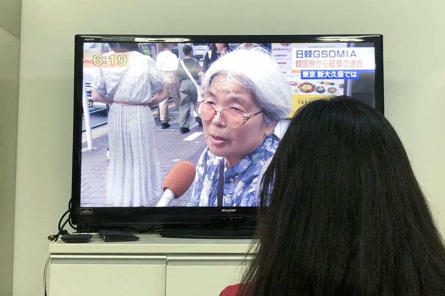 A woman is watching a TV live broadcast showing a citizen interviewed on South Korea's decision to terminate a key intelligence-sharing pact in Tokyo, Japan on Aug. 23, 2019. (Xinhua/Du Xiaoyi)