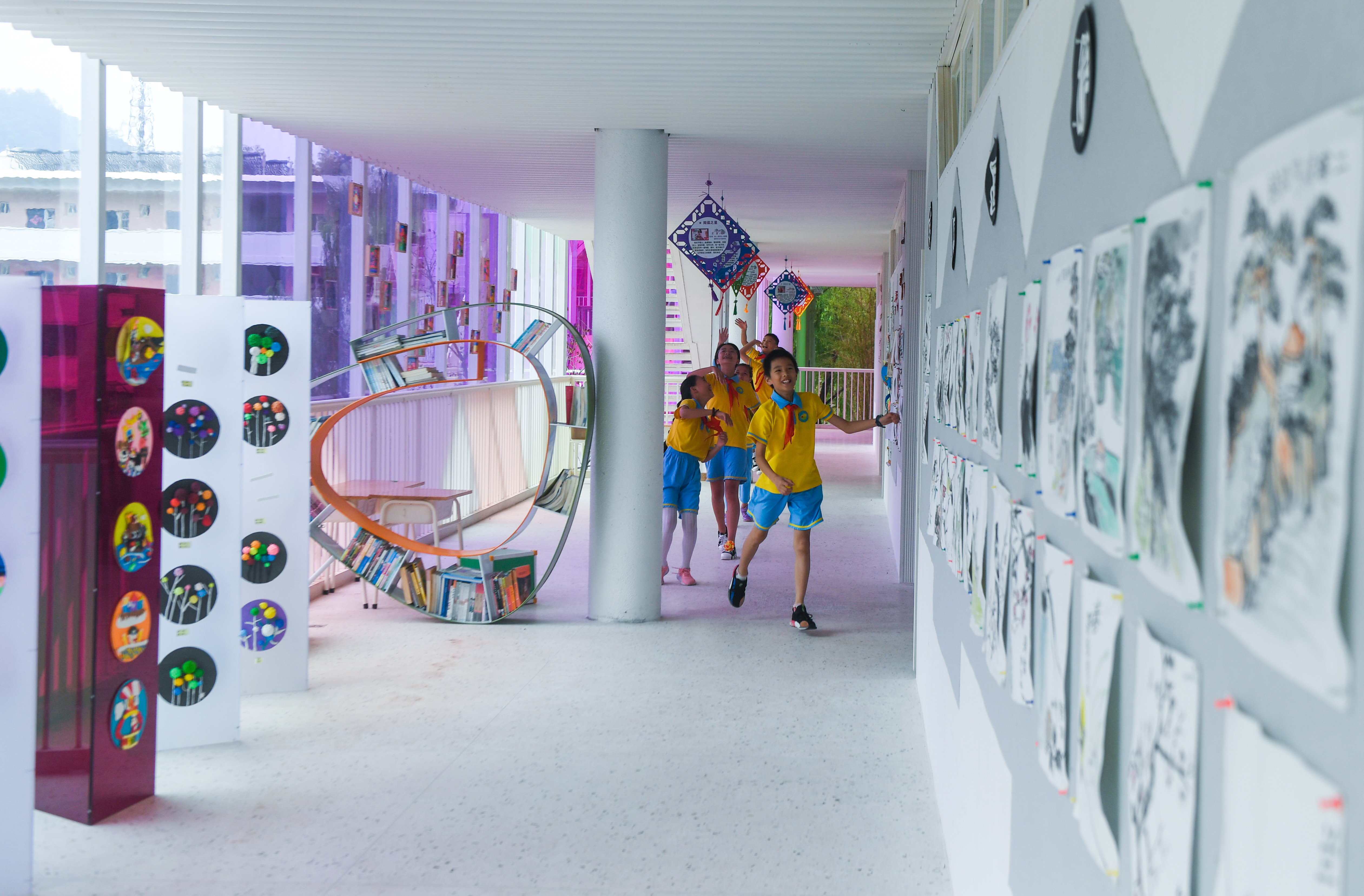 Students walk along the corridor in a teaching building in Central Primary School of Fuwen Township at Fuwen Village of Chun'an County in Hangzhou, capital of east China's Zhejiang Province, Aug. 31, 2019. (Xinhua/Xu Yu)