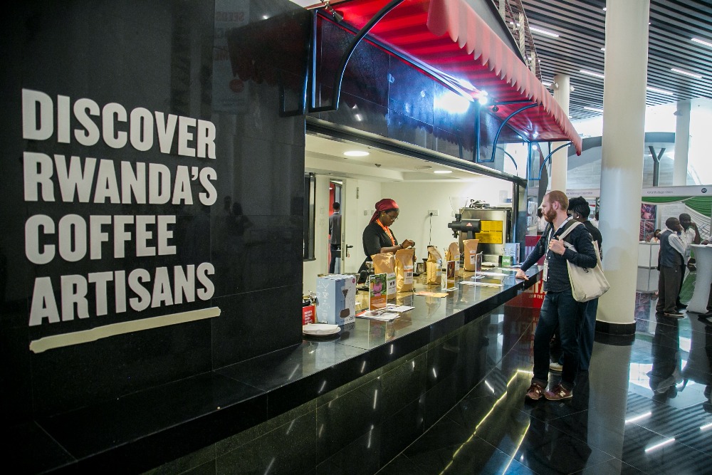 Visitors purchase Rwandan coffee at an exhibition stand during the 17th African Fine Coffee Conference and Exhibition in Kigali, Rwanda, Feb. 14, 2019. (Xinhua/Cyril Ndegeya)