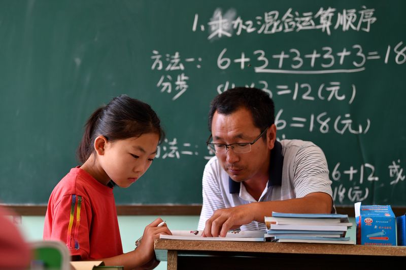 Rural teacher Wang Fuping tutors third grader Wang Huifang with her homework at Yangjiawa primary school in Yangjiawa village of Gaojiagou township of Liulin county, Lyuliang, north China's Shanxi Province. (Xinhua/Zhan Yan)