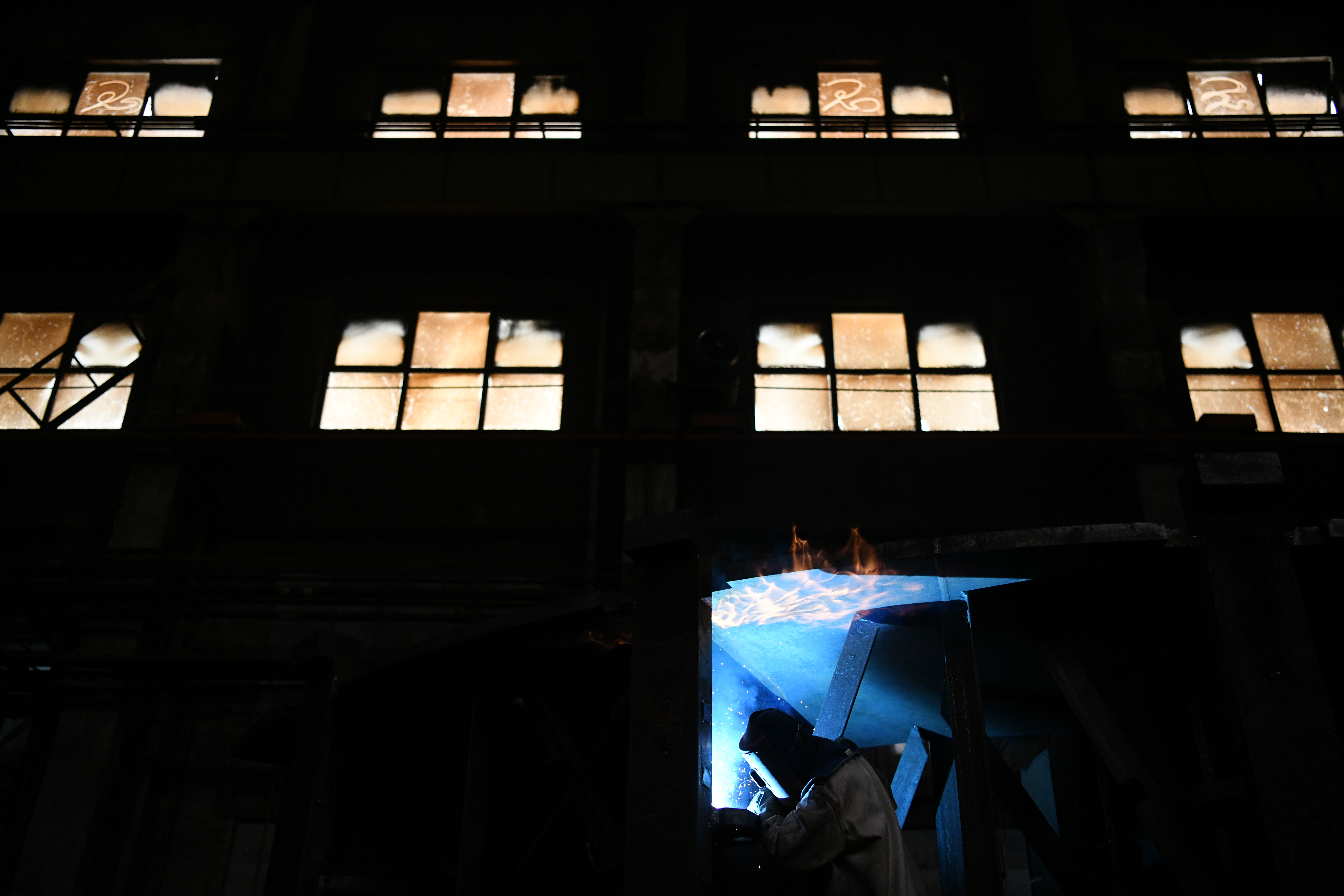 A worker welds components at a factory of Harbin Electric Machinery Company Limited in Harbin, Sept. 2, 2019. (Xinhua/Wang Jianwei)
