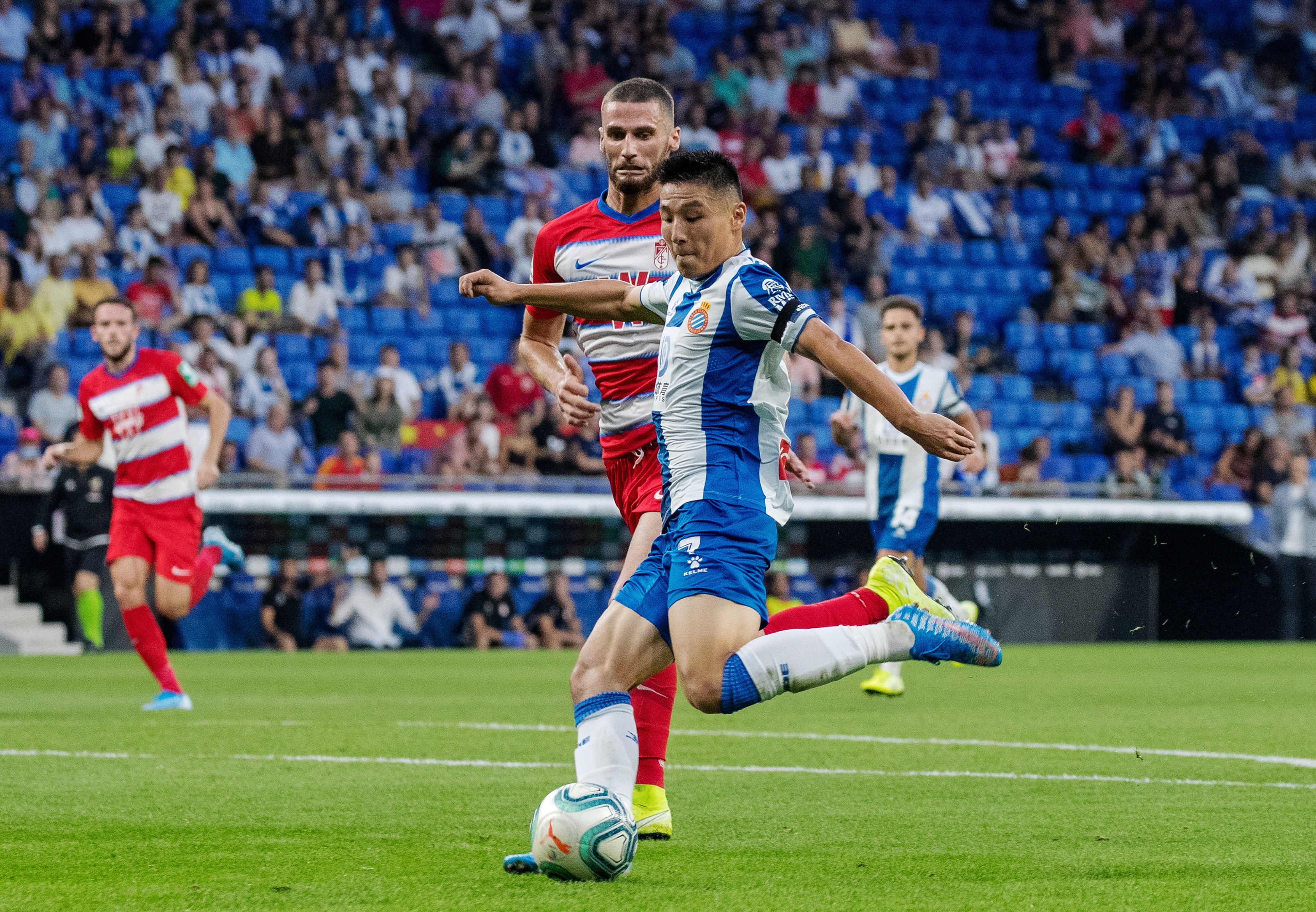 RCD Espanyol's Wu Lei (R) shoots during a Spanish league match between RCD Espanyol and Granada in Barcelona, Spain, on Sept. 1, 2019. (Photo by Joan Gosa/Xinhua)