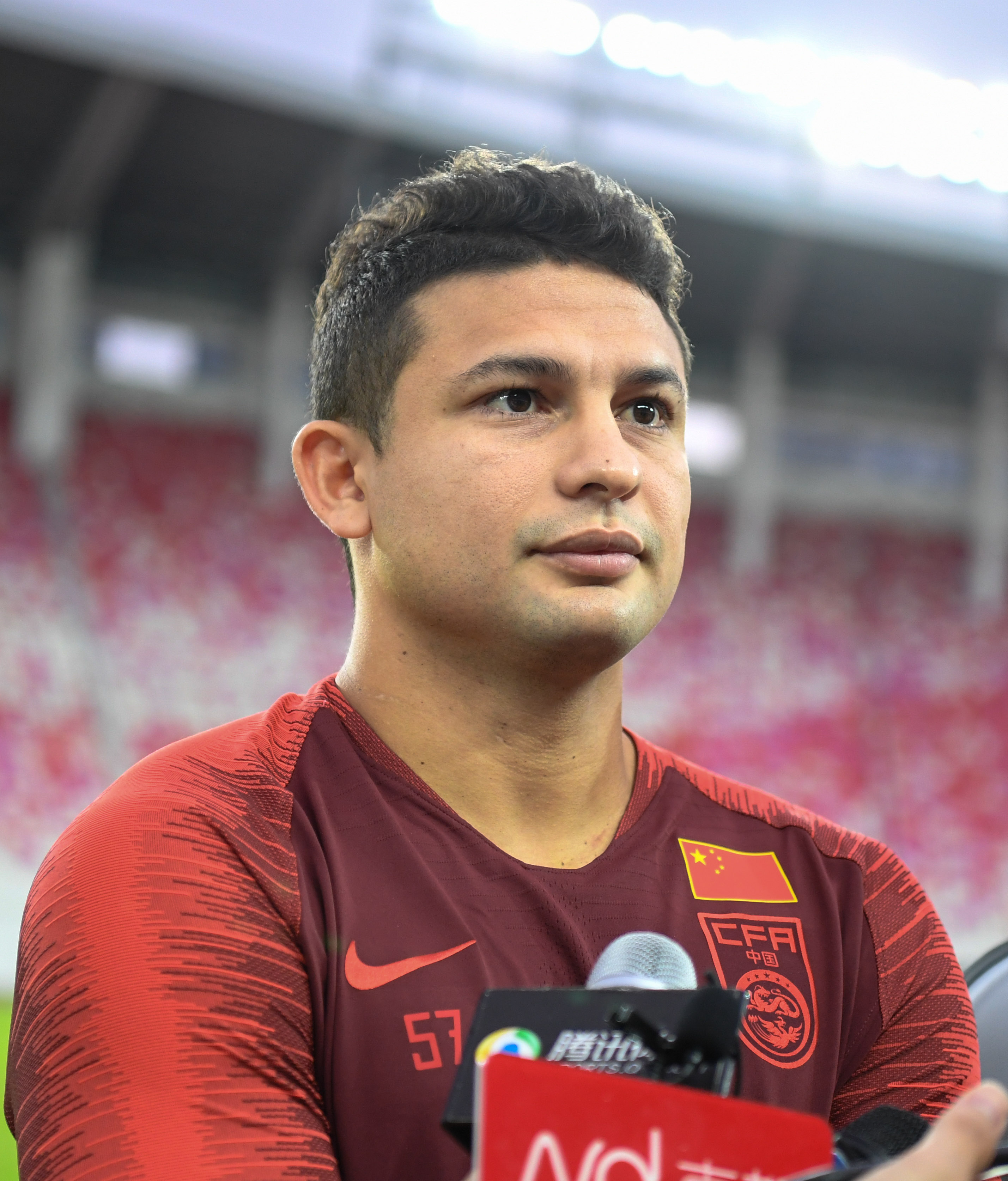Elkeson of the Chinese men's soccer team answers questions from press during a training in Guangzhou, south China's Guangdong Province, Sept. 2, 2019. The Chinese men's soccer team is preparing for the upcoming 2022 World Cup qualifiers held in Maldives on Sept. 10. (Xinhua/Deng Hua)