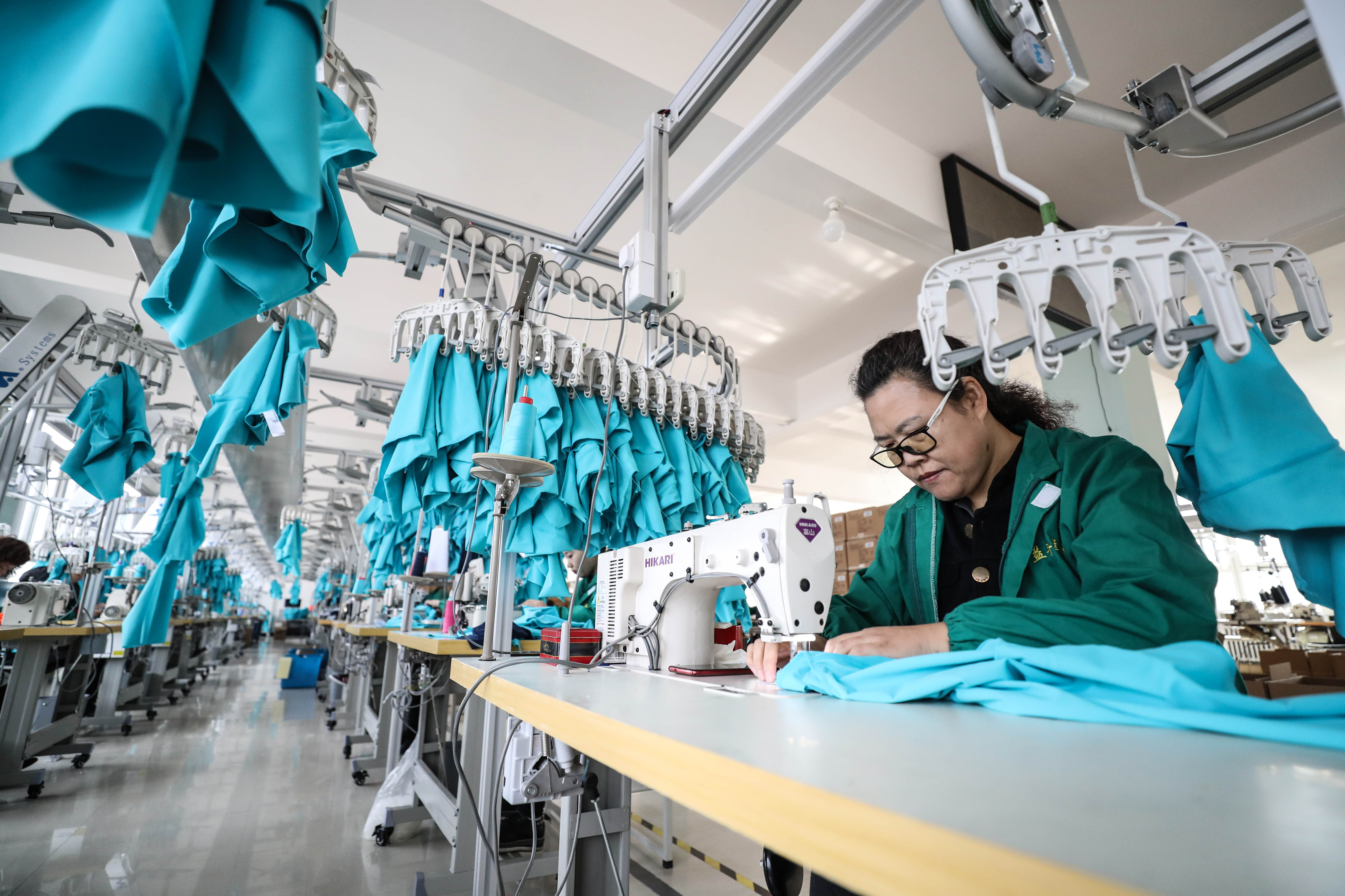 In the production workshop of Yifeng Group, a local private swimsuit maker, pieces of blue fabric are hung on the production line, waiting to undergo a 20-plus step process including cutting and sewing before being packaged and shipped to Britain.