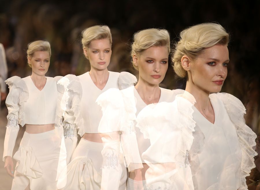 Models present creations from the Taoray Wang Spring/Summer 2020 collection during the New York Fashion Week in New York, the United States, Sept. 7, 2019. (Xinhua/Qin Lang)