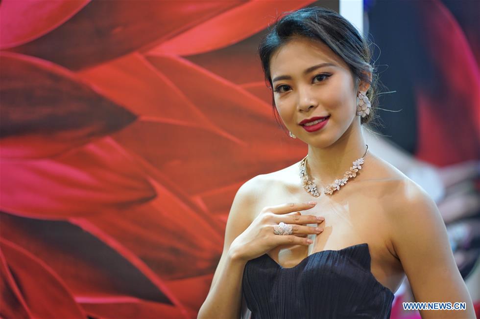 A model presents jewellery at the September Hong Kong Jewellery & Gem Fair in south China's Hong Kong, Sept. 19, 2019. The fair held from Sept. 18 to 22 at Hong Kong Convention & Exhibition Center has attracted over 3,700 exhibitors from around the world. (Xinhua/Qin Qing)