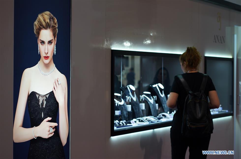 A visitor looks at jewellery exhibited at the September Hong Kong Jewellery & Gem Fair in south China's Hong Kong, Sept. 19, 2019. The fair held from Sept. 18 to 22 at Hong Kong Convention & Exhibition Center has attracted over 3,700 exhibitors from around the world. (Xinhua/Qin Qing)