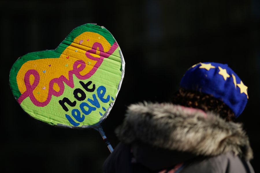 An anti-Brexit protester holds a placard outside the Houses of Parliament in London, Britain, on Feb. 14, 2019.(Xinhua/Tim Ireland)