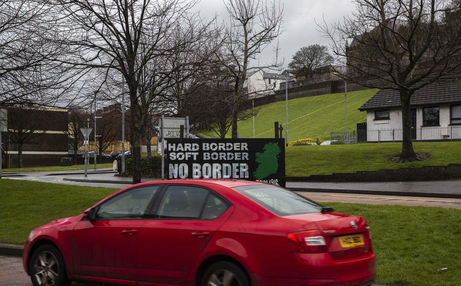 A car passes by a sign saying "Hard Border, Soft Border, No Border" in Derry, a border city in Northern Ireland, the United Kingdom, on March 18, 2019.(Xinhua/Han Yan)