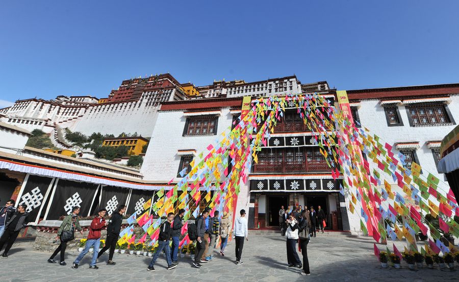 Visitors walk into the Treasure Hall during an exhibition featuring Tibetan cultural relics at the Potala Palace in Lhasa, capital of southwest China's Tibet Autonomous Region, Oct. 5, 2019. (Xinhua/Jigme Dorje)