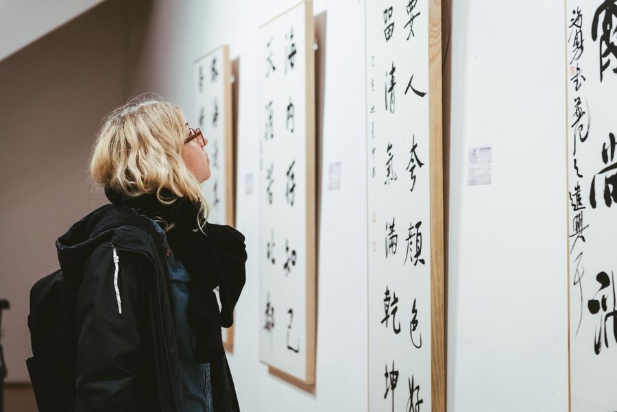 A visitor views calligraphy works during the "Ancient Wisdom of Today's Interpretation: The Beauty of Chinese Characters" exhibition in Vilnius, Lithuania, Oct. 11, 2019.(Photo by Lukas Zentalis/Xinhua)