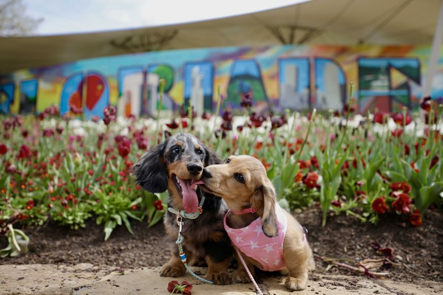 Two dogs are seen in front of flowers at Floriade, an annual flower and entertainment festival, at the Commonwealth Park in Canberra, Australia, Oct. 13, 2019. (Photo by Chu Chen/Xinhua)