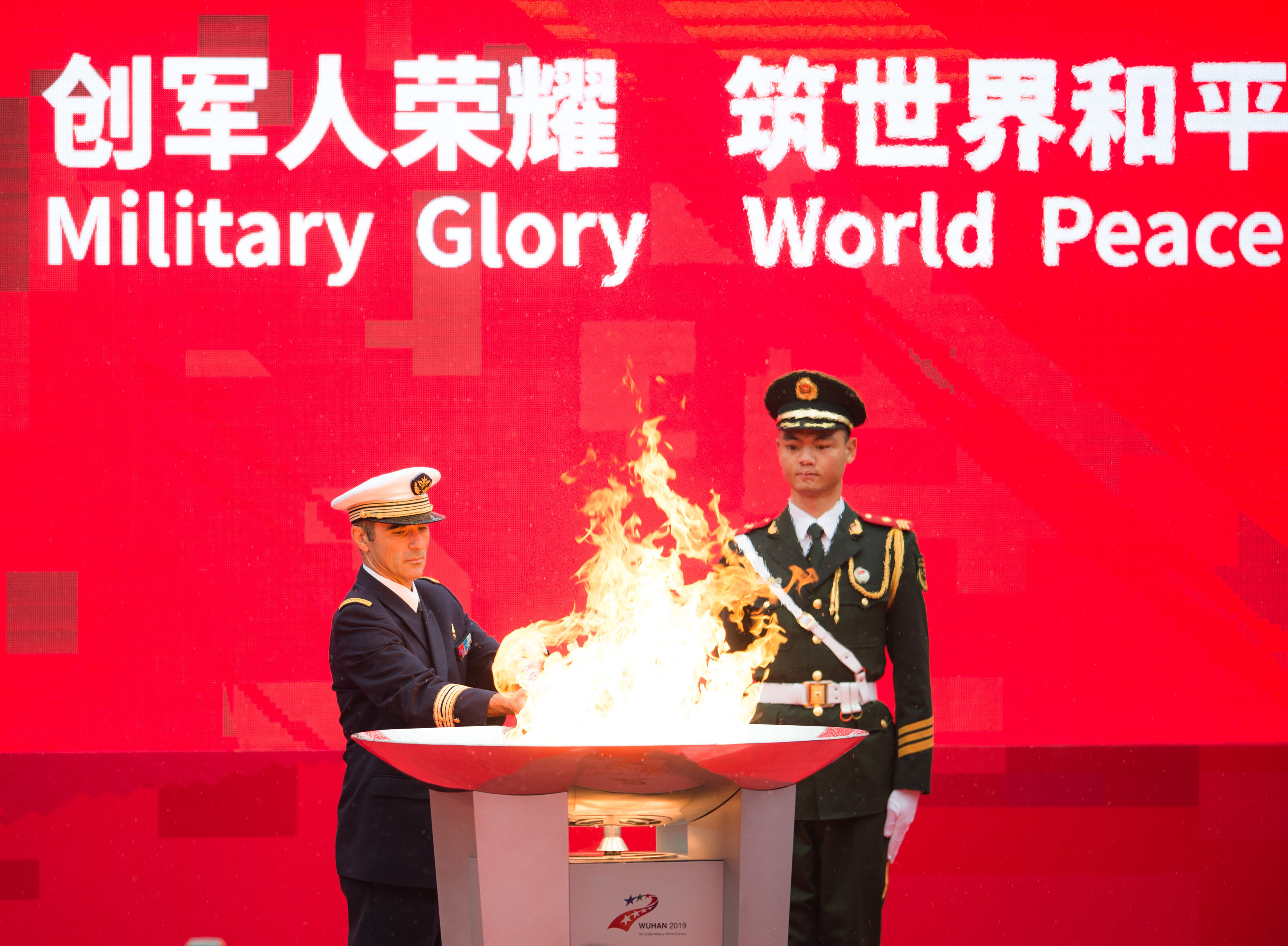 Herve Piccirillo (L), president of the International Military Sports Council (CISM), lights the torch during the 7th CISM Military World Games Torch Relay in Wuhan, capital of central China's Hubei Province, Oct. 16, 2019. (Xinhua/Xiao Yijiu)