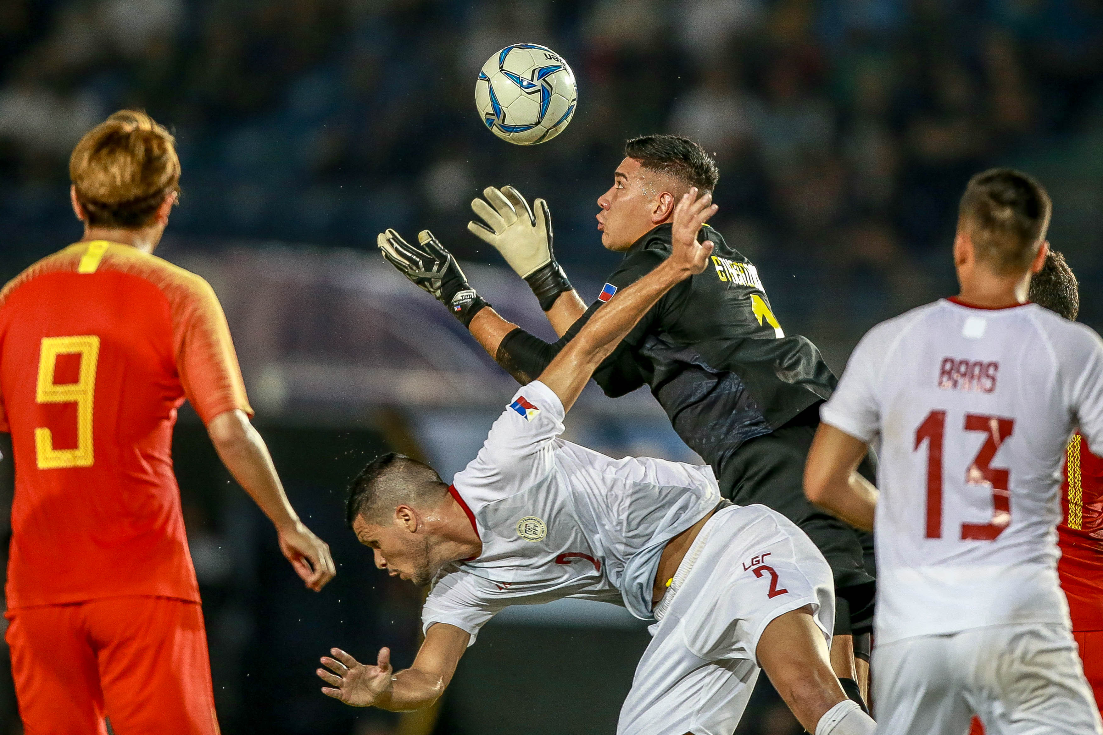 Goalkeeper Neil Leonard Etheridge (3rd L) and Alvaro Silva (2nd L) of the Philippines compete with Yang Xu (1st L) of China during the group A match at the FIFA World Cup Qatar 2022 and AFC Asian Cup China 2023 Preliminary Joint Qualification Round 2 in Bacolod, the Philippines, Oct. 15, 2019. (Xinhua/Rouelle Umali)