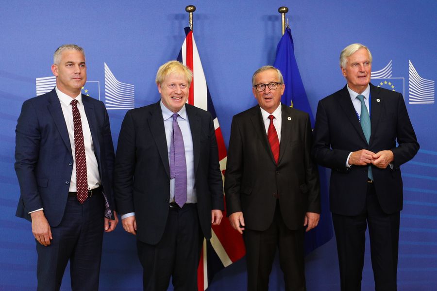 British Prime Minister Boris Johnson (2nd L), British Brexit Secretary Stephen Barclay (1st L), President of the European Commission Jean-Claude Juncker (2nd R) and the EU's chief Brexit negotiator Michel Barnier pose for photos after meeting the press at the European Commission headquarters in Brussels, Belgium, Oct. 17, 2019. (Xinhua/Zheng Huansong)